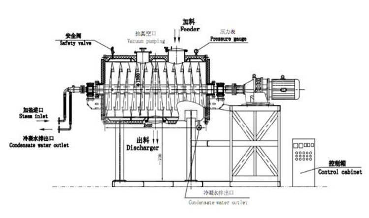 1、 裝載物料的筒體設(shè)置加熱夾套,夾套外部設(shè)置保溫層,防止熱量向環(huán)境擴散,減少熱損失;筒體下部設(shè)有卸料口,上部設(shè)有兩個加料口和一個排氣口,加料時,應(yīng)從兩個加料口同時等量加入;加料量為容積的 60%~80%,不得超過容積的 80%,否則將影響蒸發(fā)氣體的順利排出,當(dāng)所加載物料的粘性特強時,加料量應(yīng)適當(dāng)減少,以防止傳動電機過載、損壞設(shè)備。
